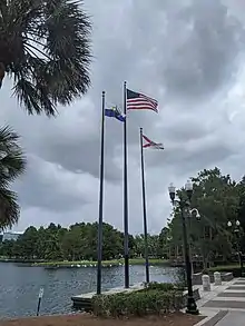 The flag of Orlando at Lake Eola alongside the flags of the United States and Florida