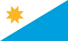 The 2022 Proposal consists of two equal sections cut diagonally in a upwards motion with the top being white and the bottom being light blue, representing the Maumee River. The diagonal shape of the flag is a reference to maritime signal flags, representing Toledo's status as a port city on Lake Erie. An eight pointed star called the "Spark of Industry" is located in the top half of the flag. The eight points on this star represent the historic and current industries of Toledo: Agriculture, Automotive, Glass, Transportation, Arts, Education, Energy, and Healthcare.[8]