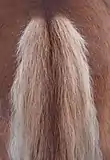 Flaxen is a genetic trait in which the mane and tail of chestnut-colored horses are noticeably lighter than the body coat color, often a golden blonde shade. Manes and tails can also be a mixture of darker and lighter hairs.[1] Certain horse breeds such as the Haflinger carry flaxen chestnut coloration as a breed trait. It is seen in chestnut-colored animals of other horse breeds that may not be exclusively chestnut.[2]