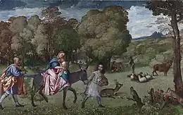 Flight into Egypt depicts the biblical voyage of the newborn Jesus, along with Mary and Joseph as described in the Gospel of Matthew.[4] The Gospel describes the Holy Family fleeing as the result of a vision from an angel, who told Joseph to bring them to Egypt since King Herod would be coming to kill the baby Jesus.[5] The painting thus takes on a dual role. It is simultaneously a religious painting, depicting the Holy Family's journey, and a landscape painting, using the Flight as the subject for a classic pastoral scene. Titian would later revisit the subject of the Flight into Egypt in his later work Rest on the Flight into Egypt around 1512.[3] That later painting, roughly 10 feet by 5 feet, appears consistent with the earlier work, in that both Mary and Joseph wear the same clothing as they do in Flight into Egypt, and they physically appear the same, suggesting the possibility that Titian used the same models for both paintings.[6]