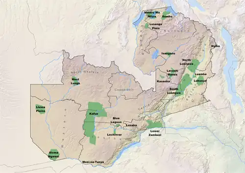 - The northern part of the Kafue Flats and Blue Lagoon National Park are in Central Province, but are treated under Southern Province, below.