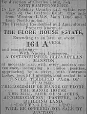 Sydney Loder sold Flore House to Charles Craig (1854-1938) in 1900. He was a partner of the Scottish blotting paper firm R. Craig and Sons.[15] In 1885 he married Katherine James Stitt (1863-1926) and the couple had one son and three daughters. The 1911 Census records the family living at Flore House with a butler, a footman and six domestic servants. They sold the house in 1924 and the advertisement for the sale is shown.