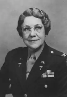 In 1935, she was assigned to Washington D.C. to the office of the superintendent, for personnel matters in the corps. She became assistant superintendent in 1939, acting superintendent in 1942, and served as superintendent from 1 June 1943 until September 1947. She was instrumental in gaining full rank for nurses, by the Army and Navy Nurse Corps Law of April 16, 1947.[7] This was preceded by temporary full commissioned status granted in 1944. During World War II, she also saw the rapid growth of the ANC from several hundred members to more than 50,000.[5] In 1947 she became the first woman to receive a military commission in the regular army.[3][4]