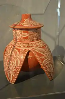 The artisan and his family create round pots, large jars called “tibores,” cantaros, flower vases, platters, bowls and other utilitarian items, as well as miniatures, storage boxes and decorative spheres. Decorative motifs include James the Greater in various forms, eagles, serpents, Tastoanes, naguals, stylized flowers, other vegetation and suns.[1]