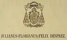 1. 1 2 He was baptized "Julien Florian Felix Desprez".[1] That full name appears in the most sources: on the stone that marks his tomb in the Cathedral of Saint Stephen in Toulouse,[2][3] a biography written when he was made a cardinal,[4] an obituary,[5] a biographical sketch published shortly after his death,[6] and a biography.[1] The Bibliothèque nationale de France and the French National Archives use these three forenames in this sequence.[7][8] When he was made a cardinal, the Holy See dropped his third forename and recorded him in Latin as "Julianus Florianus Desprez"[9] and in Italian as "Iuliano Floriano Desprez".[10] Some sources related to the First Vatican Council omit his second and third forenames: "Julien Desprez".[11][12] From his earliest years he used "Florian" as his sole given name.[13] He signed his will "Fl., Card. Desprez".[14] His pastoral letter to the clergy of Toulouse in 1869 prints his full baptismal name on the title page and records his signature on the letter as "FLORIAN, Archev. de Toulouse".[15] Similarly, he signed a letter to Pope Pius IX in Latin "FLORIANUS, Archiepus Tolosanus" and the pope replied to "FLORIANO Archiepiscopo Tolosano".[15][16] On the other hand, modern compilations of biographical information about the Catholic Church hierarchy or the College of Cardinals depart from these 19th-century sources in two ways: they transpose the names Julien and Florian and substitute "Jules" for "Julien".[17][18][19]