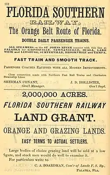 The Florida Southern Railway (later known as the Florida Southern Railroad) was a railroad that operated in Florida in the late 1800s. It was one of Florida's three notable narrow gauge railway when it was built along with the South Florida Railroad and the Orange Belt Railway. The Florida Southern was originally chartered to run from Lake City south through central Florida to Charlotte Harbor.[1] However, with the influence of Henry B. Plant, it operated with two discontinuous segments that would be part of the Plant System, which would later become part of the Atlantic Coast Line Railroad.[2]