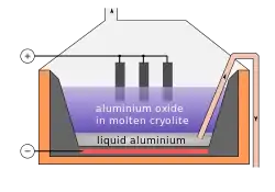 One third of HF (one sixth of mined fluorine) is used to make synthetic cryolite (sodium hexafluoroaluminate) and aluminium trifluoride. These compounds are used in the electrolysis of aluminium by the Hall–Héroult process. About 23 kg (51 lb) are required for every metric ton of aluminium. These compounds are also used as a flux for glass.[5]