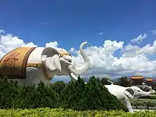 The Front Hall is flanked by the Gate of Perfect Ease and the Gate of Liberation. The lion and elephant, both accompanied by smaller cubs, welcome guests from either side of the doors. The elephant on the right, measuring five-meters tall and six meters long, symbolizes the conception of Prince Siddhartha who entered the womb of his mother on a white elephant. The lion on the left has the same measurements and represents the roar of the Buddha's teachings. Inside, visitors may borrow wheelchairs and baby-strollers from the Information Desk. There are also restaurants and a buffet.