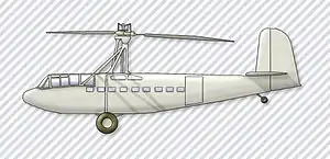 In the first half of the Second World War, the DFS 230B assault glider was used primarily to land troops and supplies, but was found of limited capability as it needed a relatively large landing area. The Fa 225 was conceived to marry the rotor of the Focke-Achgelis Fa 223 with the fuselage of the DFS 230B, allowing the glider to land in 18 m or less.[1] The rotor was mounted on a framework of struts above the centre of gravity and strengthened long stroke undercarriage units were fitted either side and at the tail.[2]