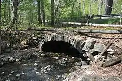 The Negro Brook Bridge, located at about 43°02′33.5″N 72°41′35.6″W / 43.042639°N 72.693222°W / 43.042639; -72.693222 (Negro Brook Bridge), formerly carried State Forest Road across Negro Brook, right near an entrance to Townshend State Forest. This bridge has a span of 14.5 feet (4.4 m) and a height of 5 feet (1.5 m). Like the other bridges, its width is limited to a single modern vehicular travel lane.[2] It is located just upstream of the current State Forest Road bridge.