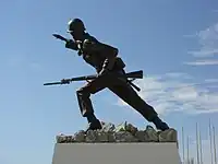 Follow Me is a United States Army memorial located at Fort Moore (formerly Fort Benning), Georgia. It was created in 1959 by two soldiers, Private First Class Manfred Bass, sculptor and designer, and Private First Class Karl H. Van Krog, his assistant.[1] The model for the statue was Eugene Wyles, an officer candidate and twenty-year Army veteran.[2] It depicts a 1950s-era infantry soldier charging forward and gesturing for others to follow.
