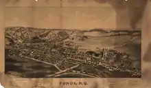 Perspective map of Fonda with list of landmarks from 1889 by L.R. Burleigh