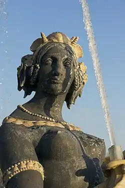 The Maritime Fountain, to the south, closer to the River Seine, represents the maritime spirit of France. Large semi-nude figures supporting the vasque represent the Mediterranean Sea and the Atlantic Ocean. Other figures beneath the vasque represent the industries of the sea; coral, fish, shells and pearls.[4]