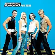 On 24 July 2000, Accolade Records issued "For Sure" as the fourth single from Four Sure, which was released two weeks later.[3][4] Music website Can't Stop the Pop noted that releasing the single in this manner was a risky manoeuvre, citing the song's dissimilarity with other Scooch tracks and the sizeable impact it had to make to successfully benefit the album, which stalled at number 41 on the UK Albums Chart upon its release.[1][5] Three formats of "For Sure" were distributed in the United Kingdom: two CD singles and a cassette single. The cassette contains the radio edit of "For Sure" plus B-side "Forever We'll Be Strong", as well as a karaoke version of the former track.[6] The first UK CD replaces the karaoke version with a home movie from Scooch while the second CD, which was issued in Australia on 18 September 2000, contains various remixes of the song plus its video and a photo gallery.[7][8][9]
