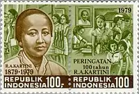 Kartini or Raden Adjeng Kartini was born a Javanese noblewoman in which she was able to attend Dutch colonial school which opened her eyes to Western ideals.[7] After reaching adulthood, Javanese tradition dictated that Kartini live a life in gender segregation as a young female noble.[3] During this time, Kartini wrote letters to her Dutch schoolmates, exposing the gender inequality emboldened by Javanese traditions which included forced marriages at a young age and the denial of education for women.[7][3] With the help of the Dutch government, Kartini opened up the first Indonesian primary school for girls that allowed all Indonesian girls to attend regardless of social status.[3] After her death in 1904, her letters were published and became symbol for the women's rights movement in Indonesia and furthered the cause of women's emancipation.[3] April 1 is now celebrated annually as Kartini Day to celebrate her birth as a national heroine.[9]
