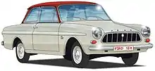 The Ford Taunus P3 had a completely new body in a very modern style. The look of car reminded some critics of a bath tub, and it consequently gained the soubriquet "Taunus Badewanne".[3] At a time when competitors boasted that all four corners of the vehicles were visible from the driver's seat, the new Taunus instead offered a streamlined form.[4] However, in Germany the concept of streamlining in cars was associated with narrow passenger cabins reminiscent of the 1930s and of the still popular Volkswagen Beetle.[4] The new Taunus, however, provided greater interior width than its predecessor, despite being no wider on the outside.[4] Although the 1.7-litre version was launched with the same 60 PS power output as the outgoing model, the new model was a full 10 km/h (6 mph) faster, which was attributed to improved aerodynamics and a lighter body shell.[4] The front end styling is reminiscent of the 1961 U.S. Ford Thunderbird and Lincoln Continental.