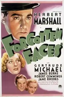 Forgotten Faces is a 1936 American drama film directed by Ewald André Dupont and starring Herbert Marshall, Gertrude Michael and James Burke.[1] Marshall and Michael had also starred in Till We Meet Again earlier in 1936.[2]