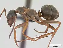Formica cunicularia is a species of ant found all over Europe.[1] They are especially common in western Europe and southern England, but they can be found from southern Scandinavia to northern Africa and from Portugal to the Urals.[1] In England, Donisthorpe records the species as having occurred as far north as Bewdley in Worcestershire.[2] In Formica cunicularia, the worker is an ashy grey black color and is usually 4.0–6.5 mm long.[1] The males are found to have a uniformly dark body and are 8.0–9.0 mm long.[1] The queen is yellowish red to dark black and is 7.5–9.0 mm.[1]