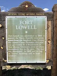 The Fort Lowell in or near Los Ojos, New Mexico, was established in 1866 and operated until 1869. It protected settlements in the area of Tierra Amarilla from the Southern Utes. It was at first named Camp Plummer and was garrisoned by New Mexico volunteers, some of whose descendants remain in its area.[1]
