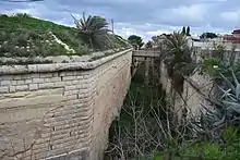 Fort Pembroke was built by the British to defend the Grand Harbour as well as part of the Victoria Lines. The building of the fort was proposed in a defence committee recommendation in 1873, and construction started on 24 January 1875 and was finished in December 1878.[2] The fort has an elongated hexagonal shape, surrounded by a ditch and glacis. It contained underground magazines and casemated garrison quarters. It was armed with three RML 11 inch 25 ton guns and one 64-pounder gun, which were mounted en barbette.