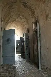 By 1906, the fort had fallen into neglect; one author commenting in this year talked of the "repulsive-looking barracks, so grim and grotesque, and smelling so damp and fusty".[8] Having long been neglected, Fort Téremba was finally restored by the action of the local Association Marguerite in 1984 who have set up the "Heritage Interpretation Center, and military prison in New Caledonia" spread over 11 ha site. The municipality have bought the site in 1987.[2][9] The main building was reconstructed and houses a permanent exhibition on the history of the fort. The watchtower, a high stone wall and a guillotine are moot witness to the history of the fort. The circular tower of the fort provides nice vistas of Teremba Bay and the neighbourhood. The fort is approached from RT1 road, 14 km west of La Foa and then along a path of about 3 km to reach the fort.[1][4]