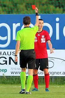 A player is shown a red card to indicate his dismissal from the game.