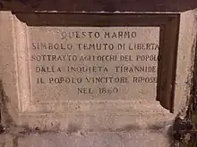 - ↑ In questa piazza che all'alba del giorno segnato vide adunarsi gl'insorti intorno all'improvvisato tricolore e primi li usi proclamare la liberta e le democratiche constituzioni ambite dai popoli. Oggi celebrandosi il primo centenario del 12 Gennaio 1848 cmoe allora il popolo di palermo accogli e consacra il voto d'un mundo che uscito da piu duro travaglio anel affratellarsi in pui liberi patti.