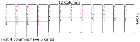 The cards are dealt face up into twelve columns, from left to right. The first four columns therefore receive an extra card. The exposed top cards of each column are available for play.