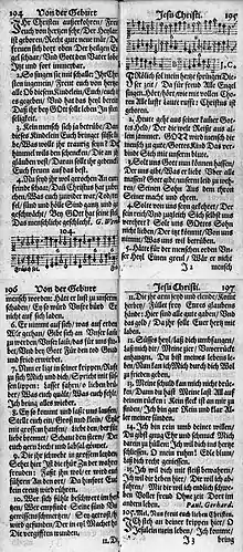 Johann Crüger first published the hymn in 1653 in the fifth edition of his hymnal Praxis Pietatis Melica, with a melody he composed himself.[3] The melody has "leaping" features and modulates often. The last line, in the first stanza saying that Christ is born, moves downward, corresponding to a move from Heaven to Earth.[4] Crüger also wrote a four-part setting.[10] Burkhart M. Schürmann composed a chorale partita of all 15 stanzas, in both German and English (All my heart), for three-part choir in 2010.[11][12]