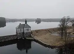 The Framingham Reservoir No. 3 Dam and Gatehouse is a historic waterworks facility in Framingham, Massachusetts. The dam and gatehouse are located at the southeastern end of Framingham Reservoir No. 3, off Massachusetts Route 9. They were built 1876–78 as part of an expansion of the public water supply of the city of Boston. The dam is 2,280 feet (690 m) long, and impounds an area of 253 acres (102 ha) in the Sudbury River watershed. The reservoir is the largest of the three Framingham reservoirs that were built at that time. The dam's core is constructed of granite rubble laid in cement. There is a granite-lined overfall area 100 feet (30 m) long, which was originally topped by flashboards. At the end of the overfall area nearest Route 9 stands the gatehouse, a granite structure with a rectangular main block and a smaller wing. Both sections have a steeply pitched slate roof. The door is in a round-arch recess, and the building is capped by a cupola. It houses controls for two 4-foot (1.2 m) mains connected to the Sudbury Aqueduct via the gatehouse at Reservoir No. 1. The water is directed either directly beyond the dam into reservoir 1 or through the 4-foot mains to the Sudbury Aqueduct gatehouse.[2]