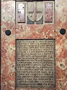 Here stands the body of Master Francis Tregian, a very eminent English gentleman who – after the confiscation of his wealth and after having suffered much during the 28 years he spent in prison for defending the Catholic faith in England during the persecutions under Queen Elizabeth – died in this city of Lisbon with great fame for saintliness on December 25th, 1608 [sic]. On April 25th, 1625, after being buried for 17 years in this church of São Roque which belongs to the Society of Jesus, his body was found perfect and incorrupt and he was reburied here by the English Catholics resident in this city, on April 25th, 1626.[4]