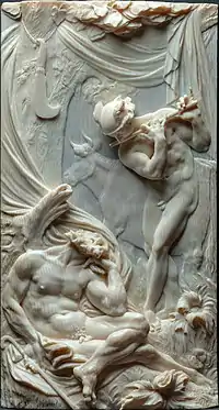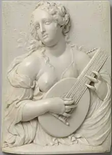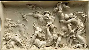 Van Bossuit's small-scale sculptures introduced replicas and variations of famous masterpieces from Antiquity to Northern Europe. His Flora and Venus with Cupid, for example, are based on important classical sculptures.[1] His first reliefs executed in Italy, such as Mercury, Io and Argus (Liebieghaus, Frankfurt) and its pendant The Flaying of Marsyas (Art Gallery of Ontario) were probably created while he was working in the vicinity of Balthasar Permoser, who created similar, but less finely sculpted works at about the same time in Italy. His Abduction of the Sabine Women (Liebieghaus, Frankfurt) is inspired by a work with the same subject by Pietro da Cortona (Capitoline Museums, Rome). His Judgement of Solomon is inspired by a fresco of da Cortona in the Palazzo Mattei in Rome.[4] His later reliefs, such as the Allegory of Music (Rijksmuseum, Amsterdam), which is part of a series of allegories from sculpture and poetry, are monumentally designed and marked by a new sobriety.[3]