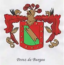 The lineage of the Pérez de Burgos family possibly has its origin in Garci Perez de Burgos or Ferrán Pérez de Burgos, a Spanish nobleman from Burgos, who participated in the Conquista of Jerez de la Frontera,[22] and who served as vassal of the Kings of Castile.[23]