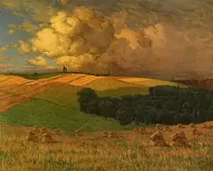 In 1891, he became involved in retouching a famous panorama by Paul Philippoteaux depicting the "Battle of Gettysburg", when it was being prepared for an exhibit in Chicago. He continued to perform this type of work throughout the 1900s and was involved in several projects that did not come to fruition. He never took it seriously and referred to it as "potboiling".[4] That same year, he and the landscape painter, Arthur Feudel (1857-1929) established a studio in Rockford. He also painted murals; notably in 1896 at the new Peoria Public Library, together with Hardesty Gilmore Maratta (1864-1924), an artist and paint manufacturer.[4] For several years after, he returned there periodically to teach drawing classes.[2]