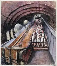At the start of World War Two, Dobson and his second wife [Caroline] Mary Bussell, whom he had married in 1931,[12][13] moved to Bristol, where a large retrospective of his work was held in March 1940. Dobson lived in the city throughout the Bristol Blitz and like several other artists painted the ruins of churches destroyed in the bombing.[14] Dobson contacted the War Artists' Advisory Committee and offered his services as both a painter and sculptor.[15] WAAC were reluctant to offer sculpture commissions but eventually did offer Dobson a short-term contract for two portrait busts of Naval personal. Later WAAC commissioned some paintings, including one of workers arriving for work at a factory that had been relocated to a tunnel.[16]