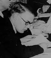 Third session of the provisional CERN council in Amsterdam on 4 October 1952. Goward is depicted on the far left side of the picture, looking down and reading. He has a side-parting and wears glasses.