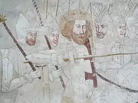 The Szécsényi brothers were one of the earliest domestic partisans of Sigismund of Luxembourg, who arrived to Hungary to validate the marriage agreement with Queen Mary. Sigismund established a court as Margrave of Brandenburg, after permanently settled in Hungary following the Treaty of Győr. On several occasions, Frank Szécsényi instructed the chancellery's clerks to issue charters.[9] After the queens' capture and imprisonment, Sigismund' influence grew which reached its peak at the rescue of Mary and his coronation as co-ruler on 31 March 1387. For his loyalty, Szécsényi was transferred to the rich urbanized Upper Hungary, where he was installed to the positions of ispán of Zólyom, Hont and Nógrád Counties, serving there until 1390.[10] Beside the ancient family estates in the region, Szécsényi was granted numerous lands and villages by Sigismund in the following years. As lord of the territories, he took an active role in the spread of ideological legitimacy of the relatively unpopular Sigismund. Since the Angevin age, the Saint Ladislaus legend provided the subjects for numerous murals painted in medieval churches in Hungary. Saint Ladislaus I of Hungary, who was the ideal of the perfect monarch, warrior and Christian for that time, was deeply venerated by Sigismund. As donator, Szécsényi ordered the preparation of murals in the churches of Rimabánya, Karaszkó, Kiéte and Rimabrézó (today Rimavská Baňa, Kraskovo, Kyjatice and Rimavské Brezovo in Slovakia, respectively),[11] which depict Biblical scenes or details from the Ladislaus legend. In the latter respect, the figure of Sigismund portrayed Ladislaus, drawing parallels between the two monarchs.[12]