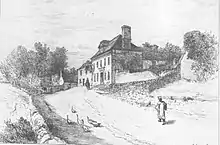 Merrill exhibited in a number of art galleries, including the Salmagundi Club in New York City.[20] A Boston newspaper reviewed an 1885 exhibition of watercolors at Chase's Art Gallery. (The Bromley Arms, which became the Donnithorne Arms in George Eliot's novel Adam Bede, was painted by Merrill when he was in England.)