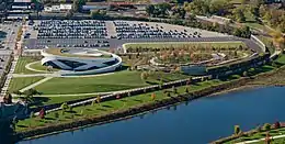 The site along the west side of the Scioto River near the Discovery Bridge on Broad Street was originally home to the Franklin County Veterans Memorial,[3] which originally opened in 1955[4] and was demolished to make way for the museum in early 2015,[5] by S.G. Loewendick & Sons.[6] The construction of a veterans museum was envisioned by city boosters and received support from former Senator and World War II veteran John Glenn.[7]