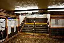 There are "store window"-style art displays on the southbound platform and a faux-newsstand on the northbound side.[21] Although the station's original wall tiling was replaced during renovations, its mosaic bands were kept; there are "Franklin Street" large mosaics, small "F" mosaics and directional mosaics "To Franklin St." and "To North Moore St."[21] The floor tiles are rose and tan colored with light and dark splotches.[21]