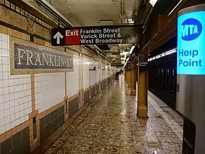 The Franklin Street station is a local station on the IRT Broadway–Seventh Avenue Line of the New York City Subway, located at the intersection of Franklin Street, Varick Street, and West Broadway.[3] It is served by the 1 train at all times and by the 2 train during late nights.