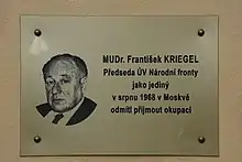 In April 1968, Kriegel became the chairman of the Central Committee of the National Front (a coalition of the Communist Party and its allied satellite parties) and a member of Presidium of the Central Committee of KSČ. As one of the main personalities during the Prague Spring, he grew to be hated by Soviet officials as well as the conservative Czechoslovak Communists. During the Warsaw Pact invasion of Czechoslovakia on 21 August 1968, he and five other main representatives of the party were arrested by the Soviet KGB and Czechoslovak StB (Šalgovič) units and deported by plane to Moscow (the others were Alexander Dubček, Oldřich Černík, Josef Smrkovský, Josef Špaček, and Bohumil Šimon).[1] Kriegel was treated particularly roughly, and made the target of anti-semitic insults.[6] He was so distrusted by the Soviets that he was not allowed to be present during the negotiations of the two parties, and when he was asked to sign the text of the concluding statement[7] he was the only one of 26 politicians to refuse.[1] "Send me to Siberia or shoot me dead", he replied.[4] He was eventually released with the others and accordingly, he voted against the Temporary Sojourn of the Soviet Army Treaty in October 1968 (with three other MPs). He was removed from the Central Committee and then expelled from the party in 1969.[1]