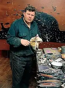![]() Fred Williams in front of Gorge landscape (oil on canvas, 1981) from the Pilbara series (photo by Rennie Ellis, 1981) | |
