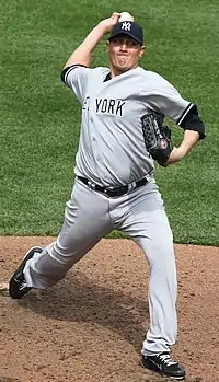 On January 31, 2011, García agreed to a minor league contract with the New York Yankees worth $1.5 million.[13] On March 25, 2011, the Yankees announced that García would be added to the major league starting rotation.[14] He finished the 2011 season with a solid 12–8 record and a 3.62 ERA,[15] however, he was consistently hammered by teams with .500 or better records, most notably the Boston Red Sox. García was on the mound in relief as the Sox won their second game of the season on April 10, as well as 2 other losses on May 15 and June 7. However, García did manage to defeat the Red Sox on September 24.