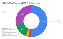 Frederick County Public Schools District staff members, spread throughout the district's sixty-nine schools and central office, totaled a number of 5,763 in the 2021–2022 school year. Out of the 5,763 staff members, 2,889 were teachers and 2,874 were classified as other staff members. There were 153 school guidance counselors throughout the district. There were 758 instructional aides in the district to assist in the academic setting. In the district administration side of staffing, there were 181 district administrators and 115 district administrative support working in the system in an administrative capacity. In the school administrative side, there were 195 school administrators working in the district which includes principals and assistant principals. 302 members of staff were classified as school administrative support.[1]