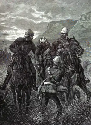 On 5 June 1879, irregulars of the 2nd Division and Wood's Flying Column unsuccessfully skirmished with about three-hundred Zulu irregulars at Zungeni Mountain and burnt four homesteads before withdrawing due to the threat of the Zulu surrounding them.[3] The 17th Lancers, as regular cavalry, were sent to the action following the withdrawal of the irregulars.[4] The cavalry was led by Colonel Drury Drury-Lowe, but the terrain was unsuited to their tactics.[5] The cavalry were unable to engage with the Zulus, who hid in the long grass and took shots at them as they passed.[6]