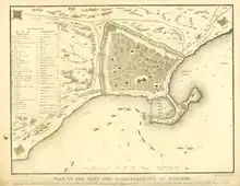 In February 1816, Aylmer was given command of the 38-gun, Endymion-class frigate, HMS Severn and on 27 August took part in the attack on Algiers by an Anglo-Dutch force.[11][12] A British fleet under Edward Pellew, comprising six line-of-battle ships, four frigates, nine smaller warships, a naval transport, a sloop and a despatch-vessel, left Plymouth at 12.00 on 28 July.[13] On 9 August they arrived off Gibraltar where they joined a Dutch squadron of five frigates and a corvette.[13] The combined fleet was kept in the bay by bad weather until 13 August when Commander James Murray arrived in the 18-gun HMS Satelitte and the fleet was given a detailed plan of action and information regarding the city's defences.[14] The city was shown to be heavily defended with more than 1,000 guns. The harbour wall alone was mounting more than 220 guns, the vast majority being between 18 and 32-pounders. The harbour entrance was guarded by another three batteries to the southwest, the largest being the Fish Market battery of 15 guns in three tiers, and it was this battery that Aylmer in Severn was charged with destroying.[15][16] Spreading south, along the coast, were a number of other batteries and, on the opposite side of the bay, facing the harbour entrance, a fort. These coastal defences mounted a further 60 to 70 guns. Inland, on the areas of higher ground stood various other batteries and a further fort.[15] The northern side of the city was not so well defended with fewer than a hundred cannon but the depth of water on this side made an approach impossible. The harbour itself contained four heavy frigates, five large corvettes and between 30 and 40 smaller armed vessels, and 40,000 extra men had been brought in to protect the city.[17]