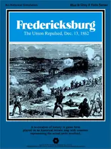 In 1975, SPI published Blue & Gray: Four American Civil War Battles, its first quadrigame — four different battles using the same set of rules, packaged into one box. The concept proved very popular, and SPI quickly produced Blue & Gray II, which rose as high as #4 on SPI's Top Ten Bestseller list, and stayed on the list for 6 months.[5] The four games in Blue & Gray II were Hooker and Lee; Battle of the Wilderness; Chattanooga; and Fredericksburg. The latter was designed by Joe Angiolillo, with graphic design by Redmond A. Simonsen. It was also released as an individual game packaged in a double LP-sized cardstock folio.[3] It was not the most popular game in Blue & Gray II; in a poll conducted by SPI to determine the most popular board wargames in North America, Fredericksburg placed 65th out of 202 games (compared to 44th for Hooker and Lee, 54th for Chattanooga, and 80th for Battle of the Wilderness.)[4]