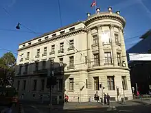 In 1851, the task of creating an impressive building to replace the old "Kaufhaus" (shopping hall) was entrusted to the Basel architect Johann Jakob Stehlin the Younger. This new building was intended for the recently established Swiss Post, which had been founded just two years prior. The Basel Main Post Office thus became one of the first prestige buildings of the newly formed state corporation in Switzerland. In 1881, it was extended up to the "Rüdengasse" by the Viennese architect Friedrich von Schmidt.[6]
