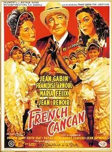French Cancan (also known as Only the French Can) is a 1955 French-Italian musical film written and directed by Jean Renoir and starring Jean Gabin and Francoise Arnoul. Where Renoir's previous film Le Carosse d’or had celebrated the 18th-century Italian commedia dell’arte, this work is a homage to the Parisian café-concert of the 19th century with its popular singers and dancers. Visually, the film evokes the paintings of Edgar Degas and the Impressionists, including his own father, Pierre-Auguste Renoir.[2] It also marked his return to France and to French cinema after an exile that began in 1940.[3]